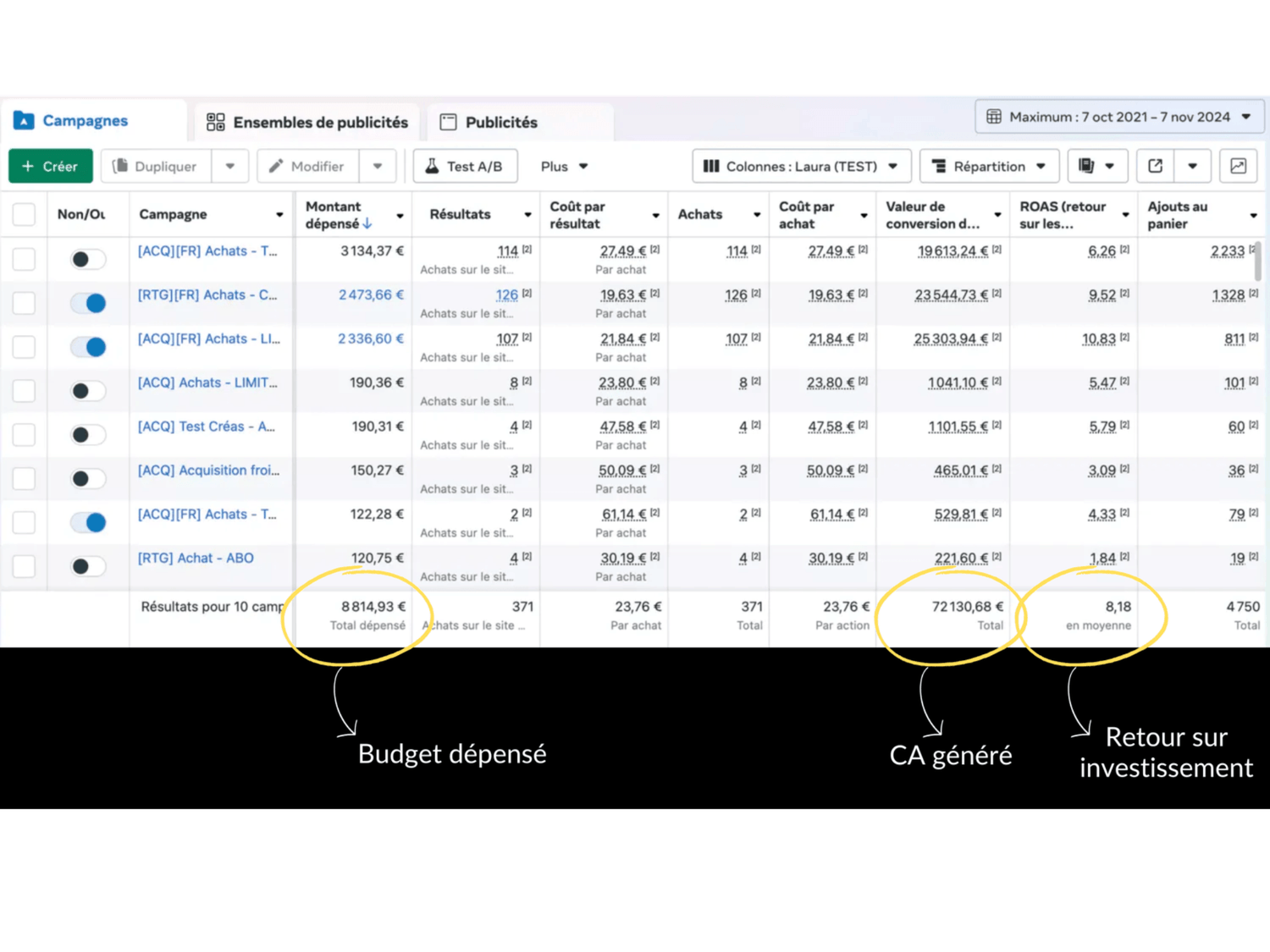 Générer des ROAS positifs et générer beaucoup plus de CA que de dépenses :